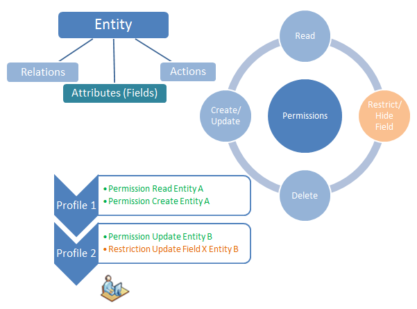 Every record of Permission corresponding to an entity specifies privileges on level of Read, Create, Update and Delete actions that can be performed on the entity. The possible levels are All, Filtered or None. For filtered privilege a subsequent security filter is specified. Such security filter limits the data of the entity that can be read or actions like create, update or delete can be performed on them. Besides CRUD operations Permission also enables configuring other access like seeing related records, access on documents attached with such records, UI form and view abstraction, access to other actions possible on the entity records and field level restrictions like hiding specific fields, preventing create or update of specific fields.