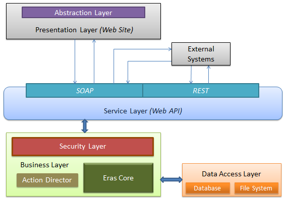 All data access and actions possible in Eraspaas are made available through web service API (both in REST and SOAP protocols); the security implementation resides inside the business logic that has operations which are accessible through Eraspaas action service.